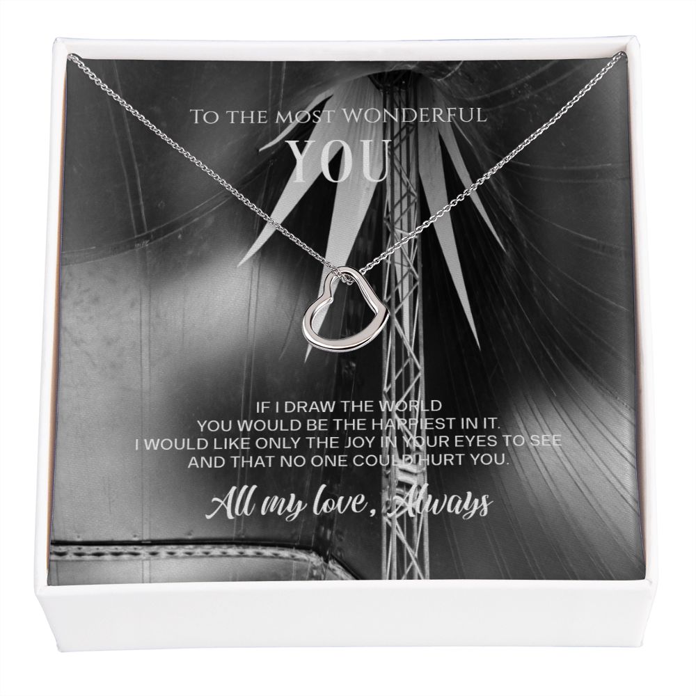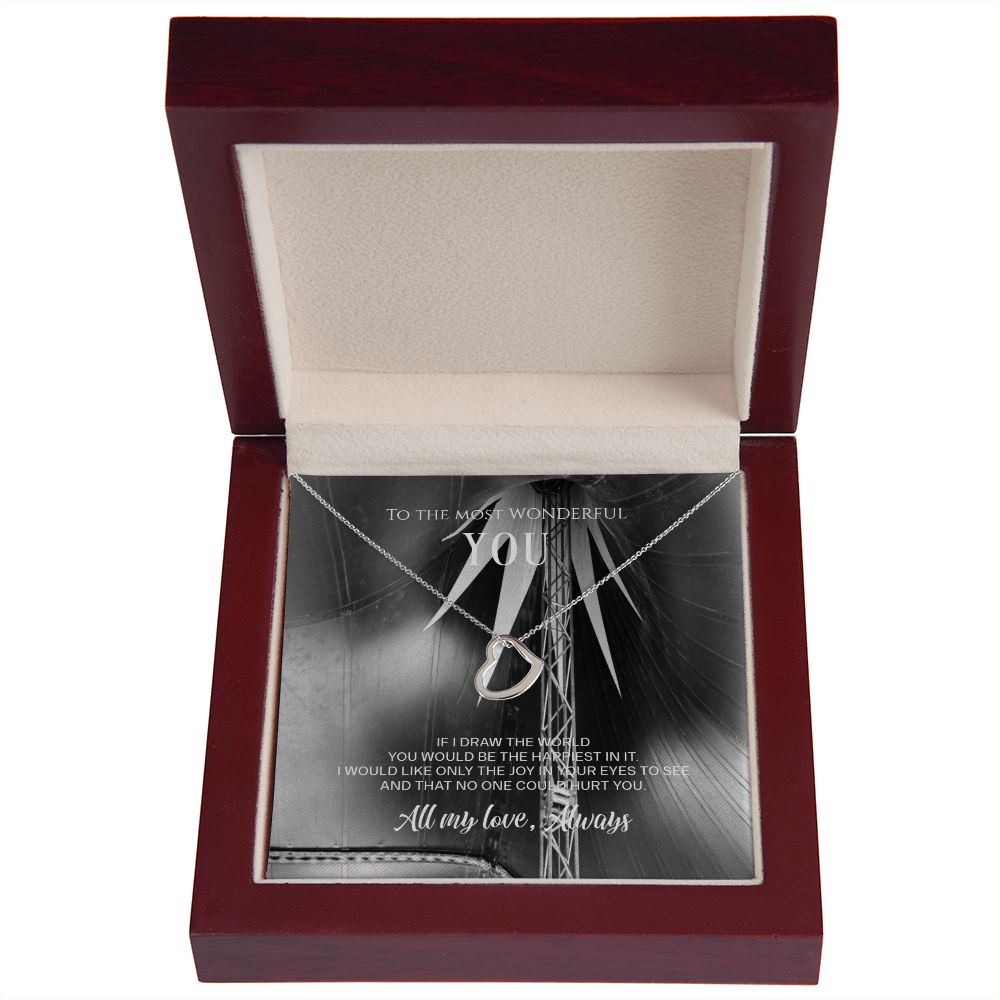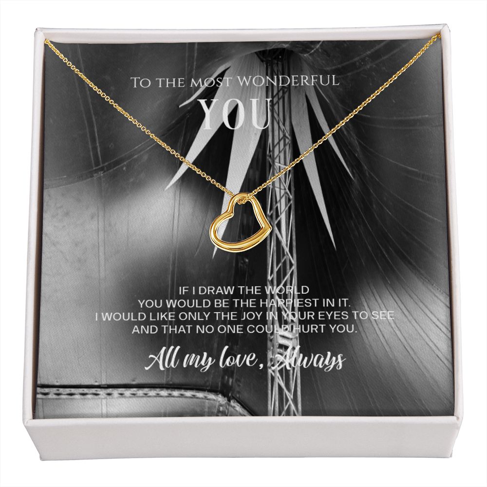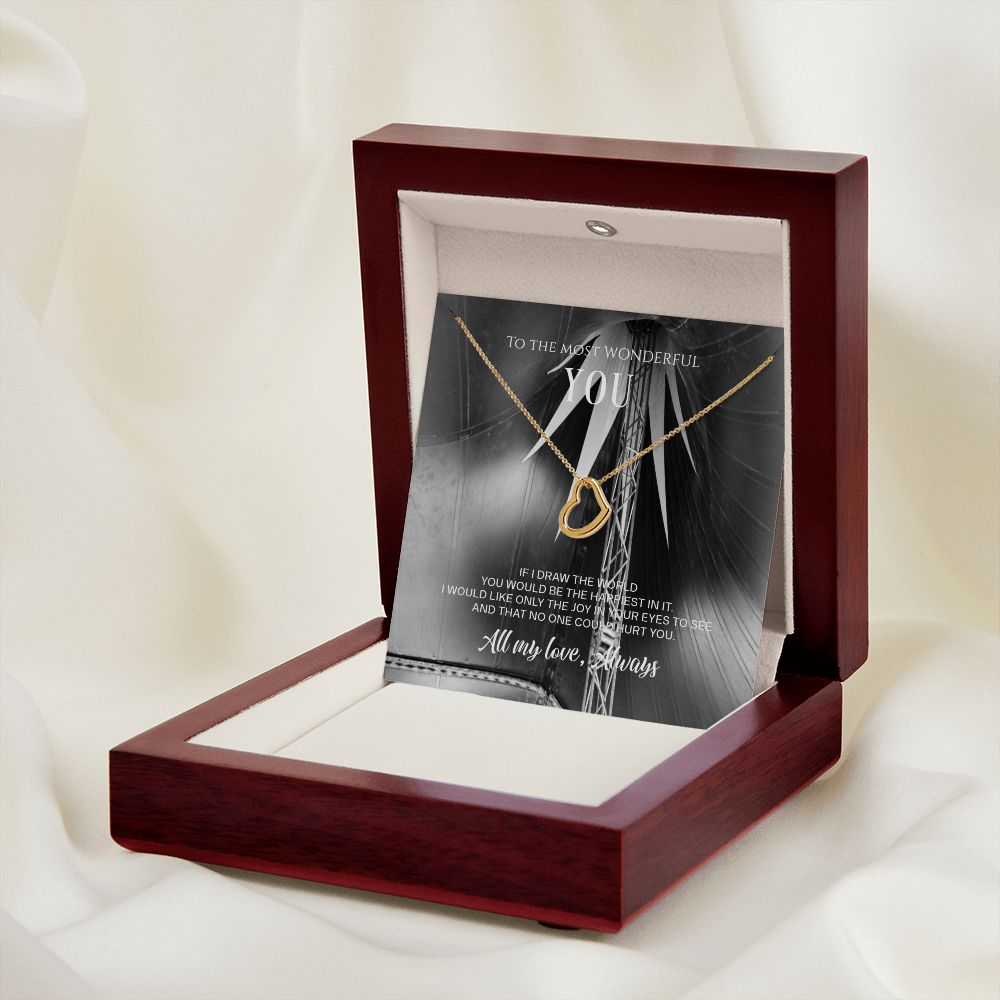 Imagine her delight when she sees this beautiful Delicate Heart Necklace, lovingly crafted in sterling silver and dipped in 14k white gold or 18k yellow gold for added luxury. This piece is pure elegance wrapped up in timeless simplicity. Trends may come and go, but this piece will last a lifetime with its classic subtle beauty.